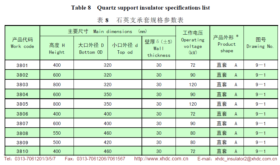 The quartz support insulator can be used under the temperature ≤500℃ with the operating voltage ranging from 72kV to 120kV and a mechanical compressive failing load not less than 300kN.