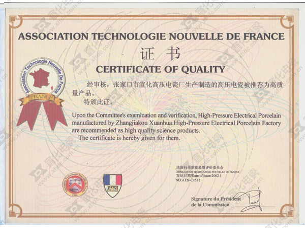 2002年,榮獲法國科技質(zhì)量監(jiān)督評(píng)委委員會(huì)“高壓電瓷高質(zhì)量產(chǎn)品”
