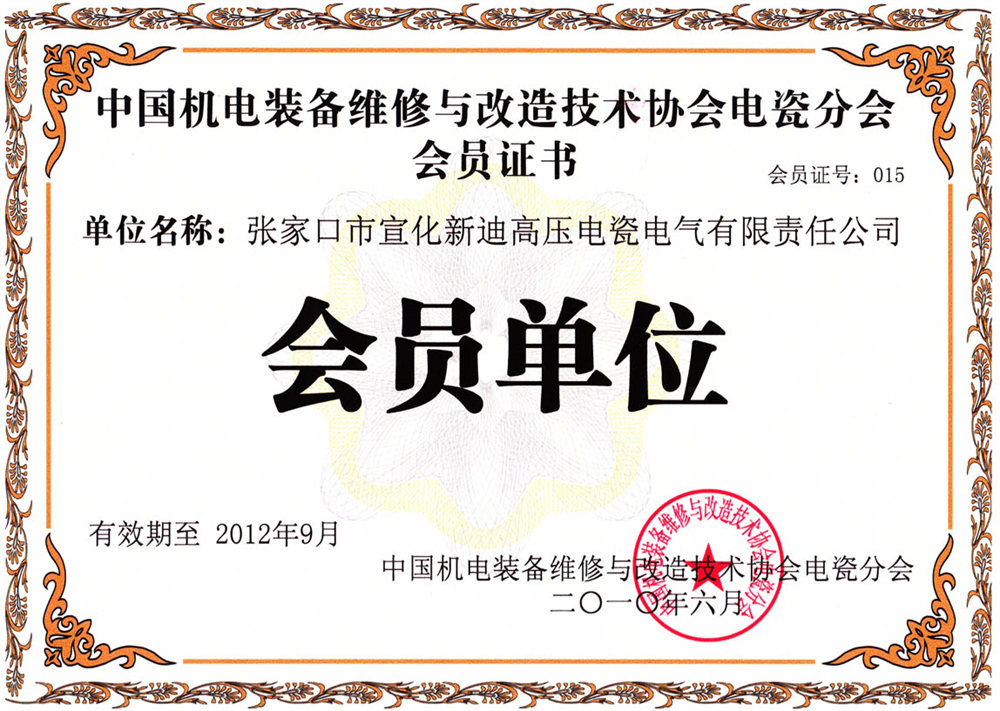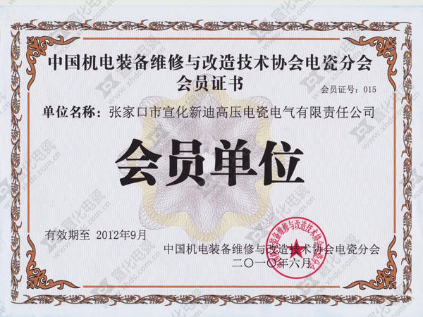 2010年6月榮獲“中國(guó)機(jī)電裝備維修與改造技術(shù)協(xié)會(huì)電瓷分會(huì)-會(huì)員單位”