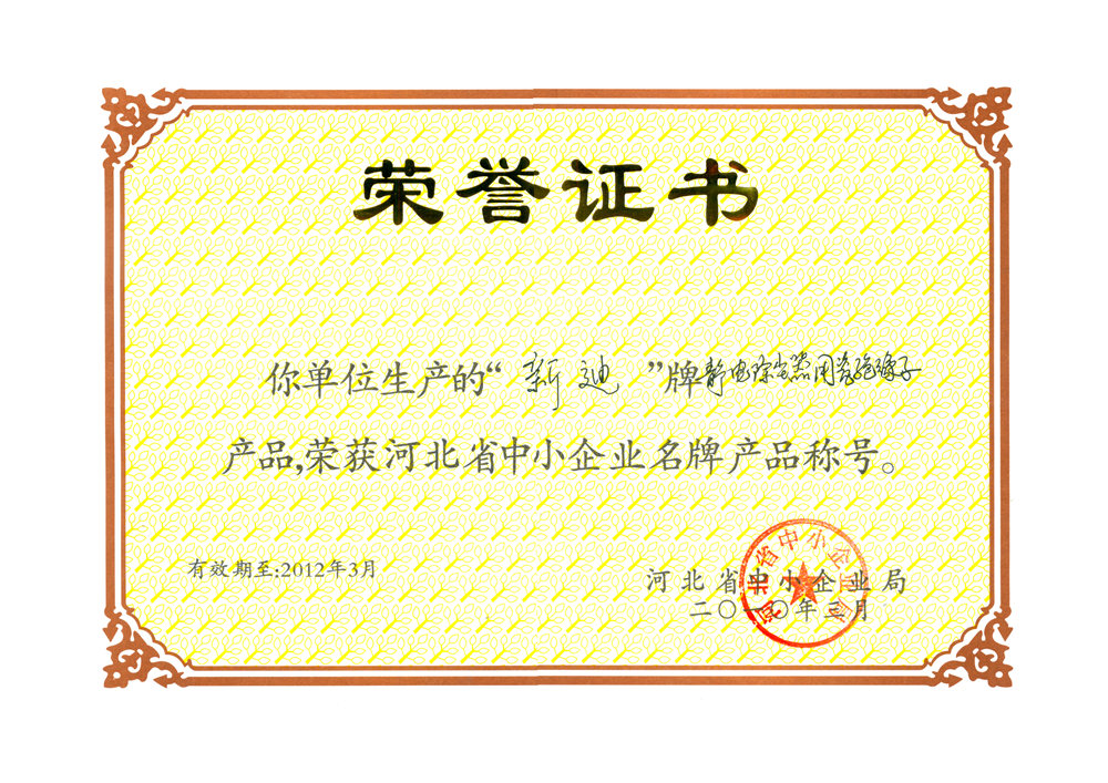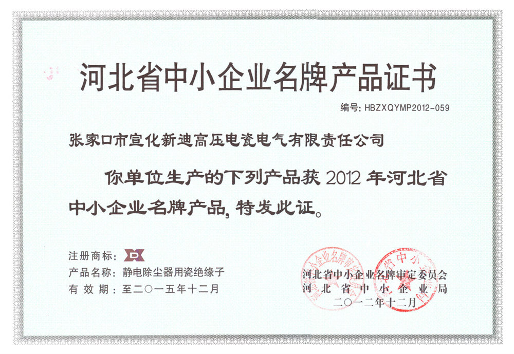 2012年12月,榮獲河北省中小企業(yè)名牌審定委員會(huì)“靜電除塵器用瓷絕緣子”名牌證書