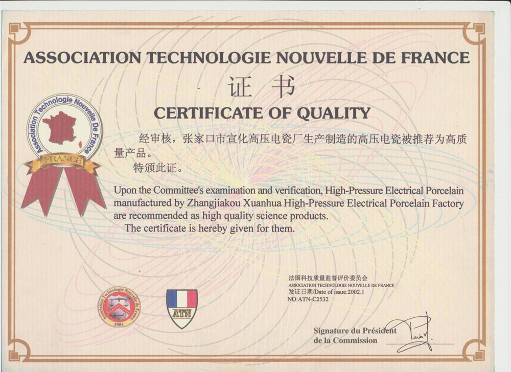 2002年,榮獲法國(guó)科技質(zhì)量監(jiān)督評(píng)委委員會(huì)“高壓電瓷高質(zhì)量產(chǎn)品”