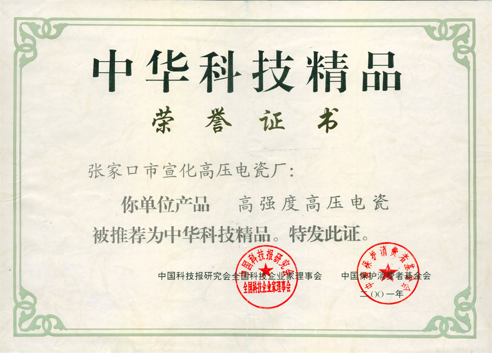 2001年榮獲“高強(qiáng)度高壓電瓷”被中國(guó)科技報(bào)研究會(huì)全國(guó)科技企業(yè)家理事會(huì)、中國(guó)保護(hù)消費(fèi)者基金會(huì)推薦為中國(guó)科技精品