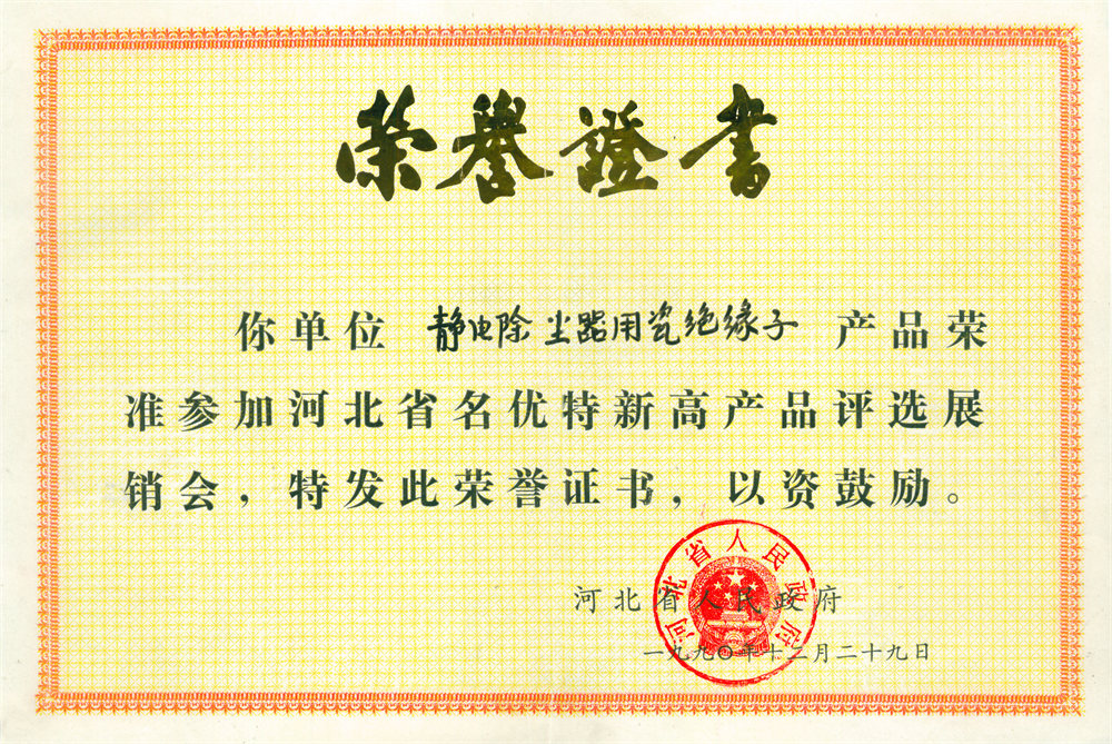 1990年12月靜電除塵器用瓷絕緣子”產(chǎn)品榮準(zhǔn)參加河北省名優(yōu)特新高產(chǎn)品評(píng)選展銷會(huì)榮譽(yù)證書