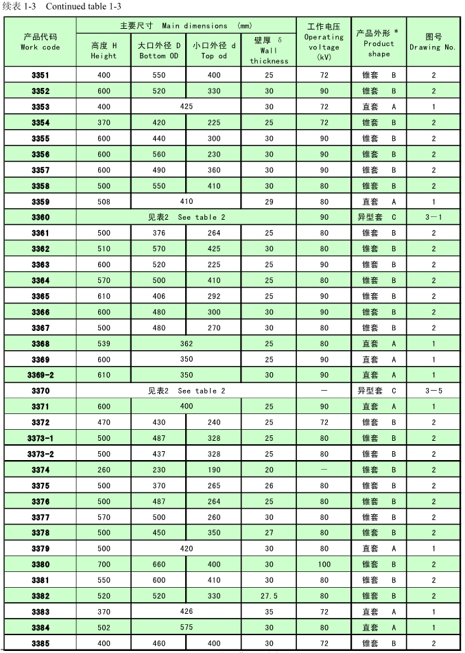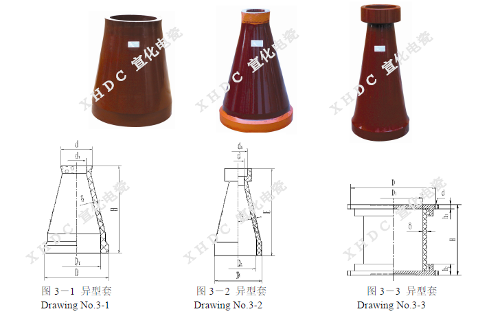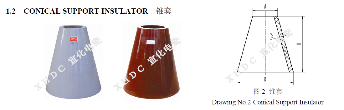 支承瓷套絕緣子(簡稱支承瓷套)用于電暈極懸掛框架吊桿穿過場(chǎng)殼體處的密封和高壓絕緣。根據(jù)產(chǎn)品外形特征分為直套、錐套和異型套三類。